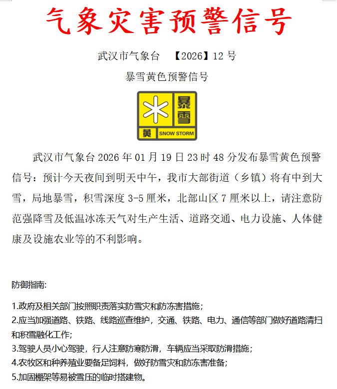 目前,武汉市正在生效的预警信号共有37条,包括寒潮、大风、道路结冰、暴雪等。
