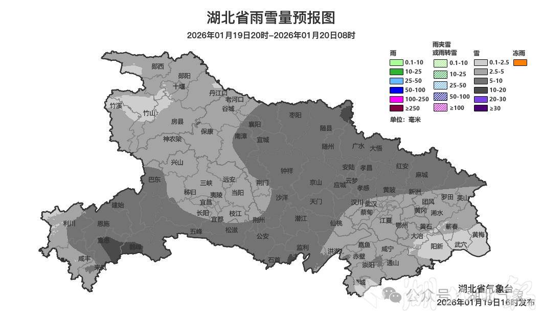 气象专家介绍,18日07时至19日07时,随着寒潮渗透南下,多地雨雪上线,其中十堰、襄阳、神农架、宜昌西部、随州、孝感北部出现雨夹雪(冻雨或雪);鄂西南和江汉平原有小雨,其他地区多云到阴天。省内大部地区出现偏北阵风6到8级,黄陂、秭归、荆门等地局地达9到10级。最高气温鄂西南和鄂东地区10至19℃、其他地区1至8℃,相较前一天大部地区普遍降温5~8℃。19日20时至20日20时,襄阳、神农架、恩施、宜昌、随州、荆门、荆州、孝感、天门、武汉、鄂州、黄冈、黄石、咸宁部分地区有中到大雪、局地暴雪,积雪深度2~5厘米,山区5~10厘米,局地10厘米以上。未来三天全省风力强劲,局地达9级。预计21日下午至22日,全省降雪减弱,西部和南部小雪转阴天。23日天气短暂放晴,24日晚至26日还有一次雨雪天气过程,但降雪范围和强度不及此次过程。