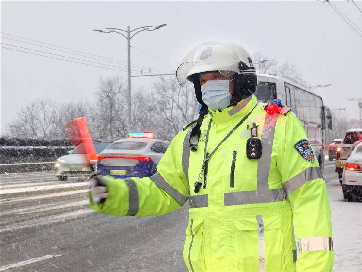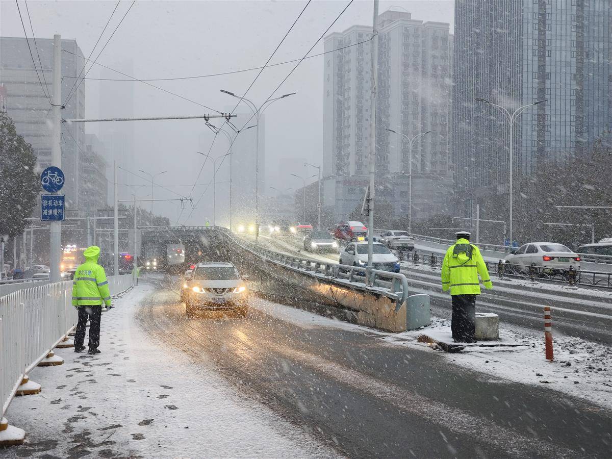 武汉江汉一桥,交警在雪中指挥交通。(湖北日报全媒记者 柯皓 摄)