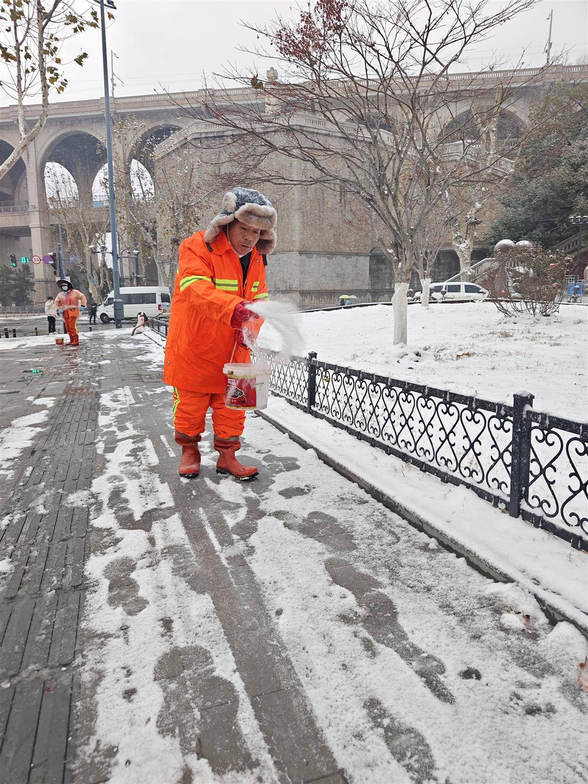 武汉临江大道,环卫工为人行道在撒盐融雪。(湖北日报全媒记者 柯皓 摄)