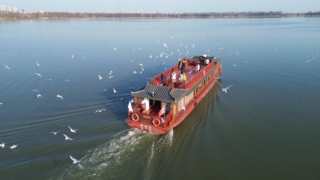东湖游船楚风园码头至磨山码头的常规航线串联起多处鸥群聚集区,每日九点半开第一班船,末班船为四点半,周末更是加密循环发船,实现游客“随到随上”。今年,东湖游船还优化推出“观鸥专线”,营运时间为上午十点至下午四点,一天七班整点发船。从楚风园码头登船,环湖一圈45分钟不靠岸,特别开放二层全景观甲板,确保沉浸式的观赏体验。