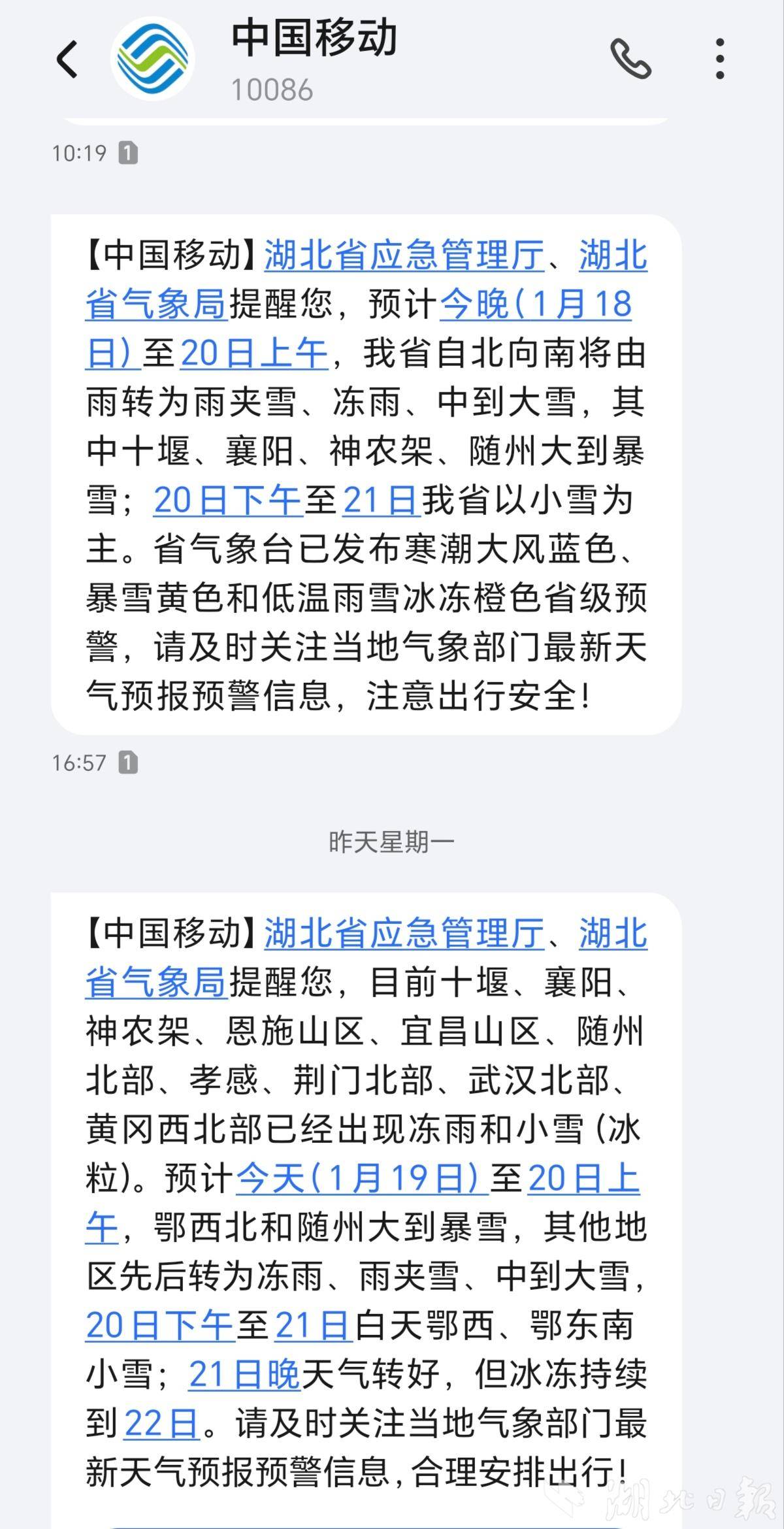 据了解,19日6时至20日6时,十堰东部(城区、郧阳、丹江口)、襄阳、神农架、随州等地出现大雪到暴雪,积雪深度普遍达6~15厘米,谷城、枣阳、随县、襄阳襄州区、保康、宜城、丹江口等多地积雪深度更是超过10厘米,厚实的积雪给交通出行和群众生活带来不小挑战。省应急厅联合省气象局向全省6400万手机用户精准推送预警短信2次;全省气象部门向39.6万人次责任人点对点推送提示。