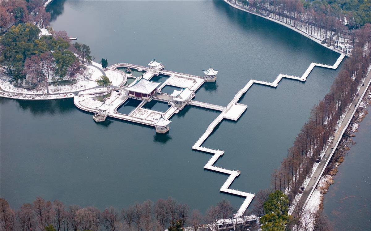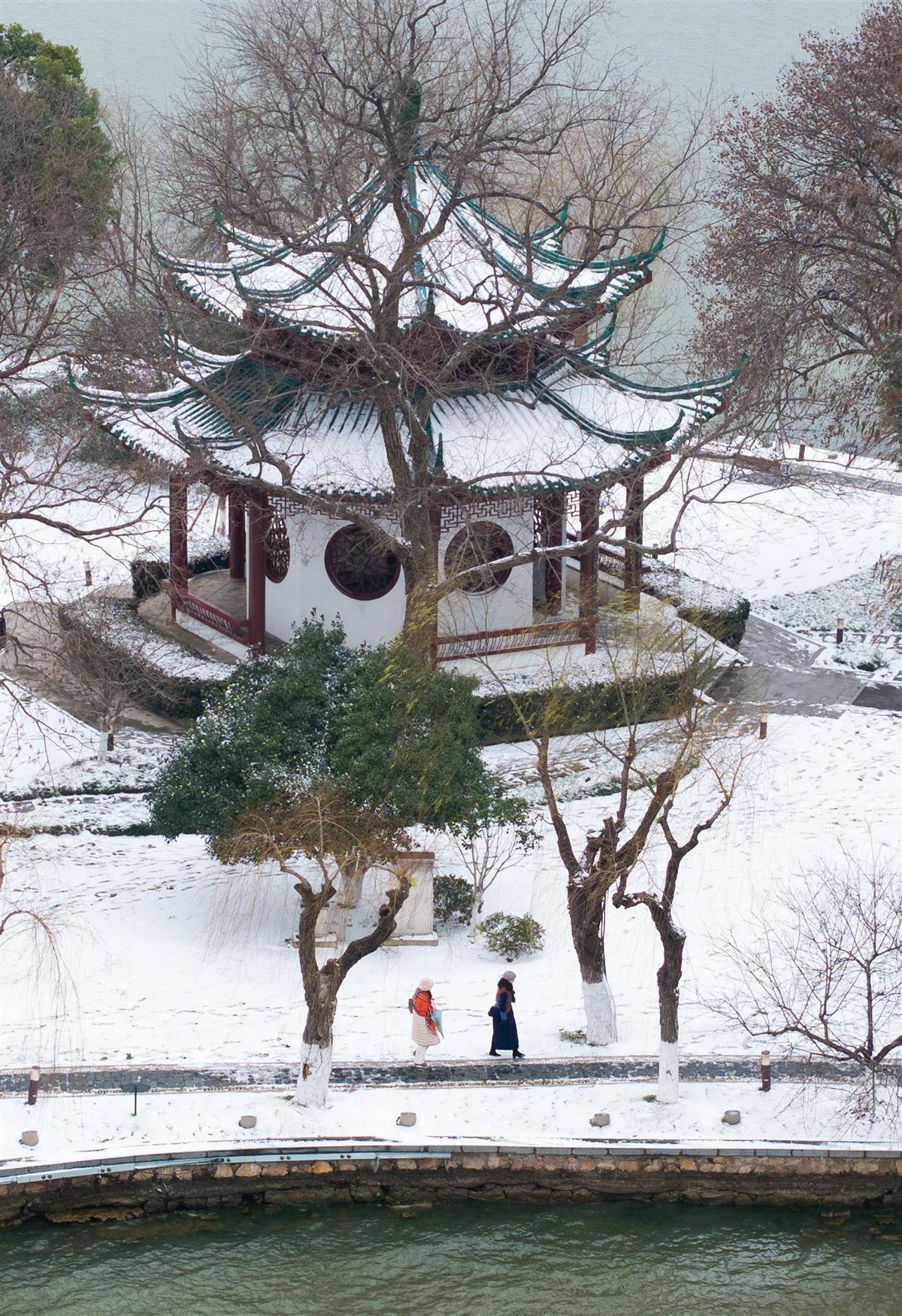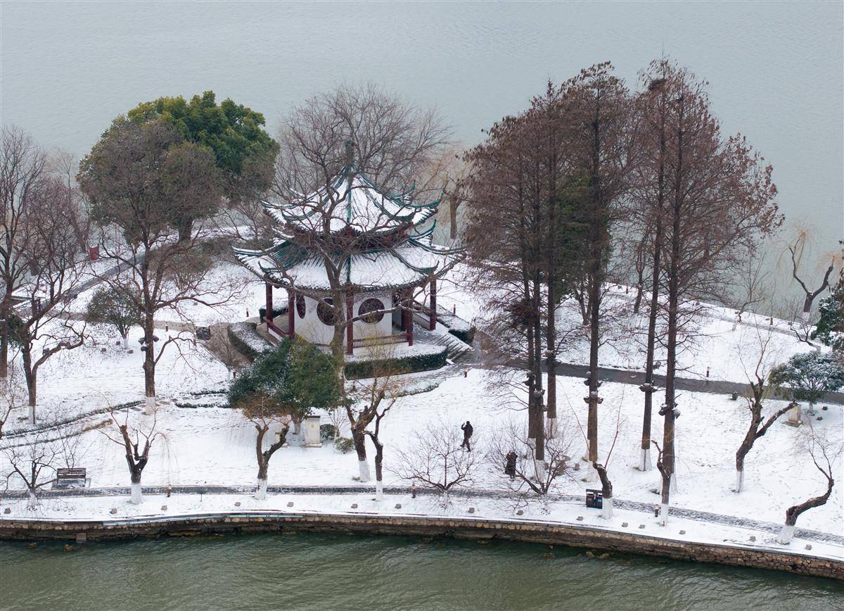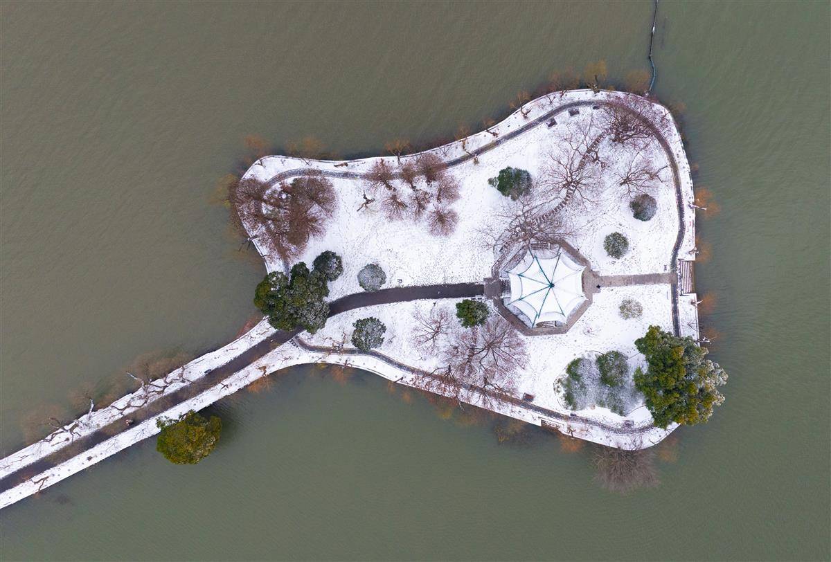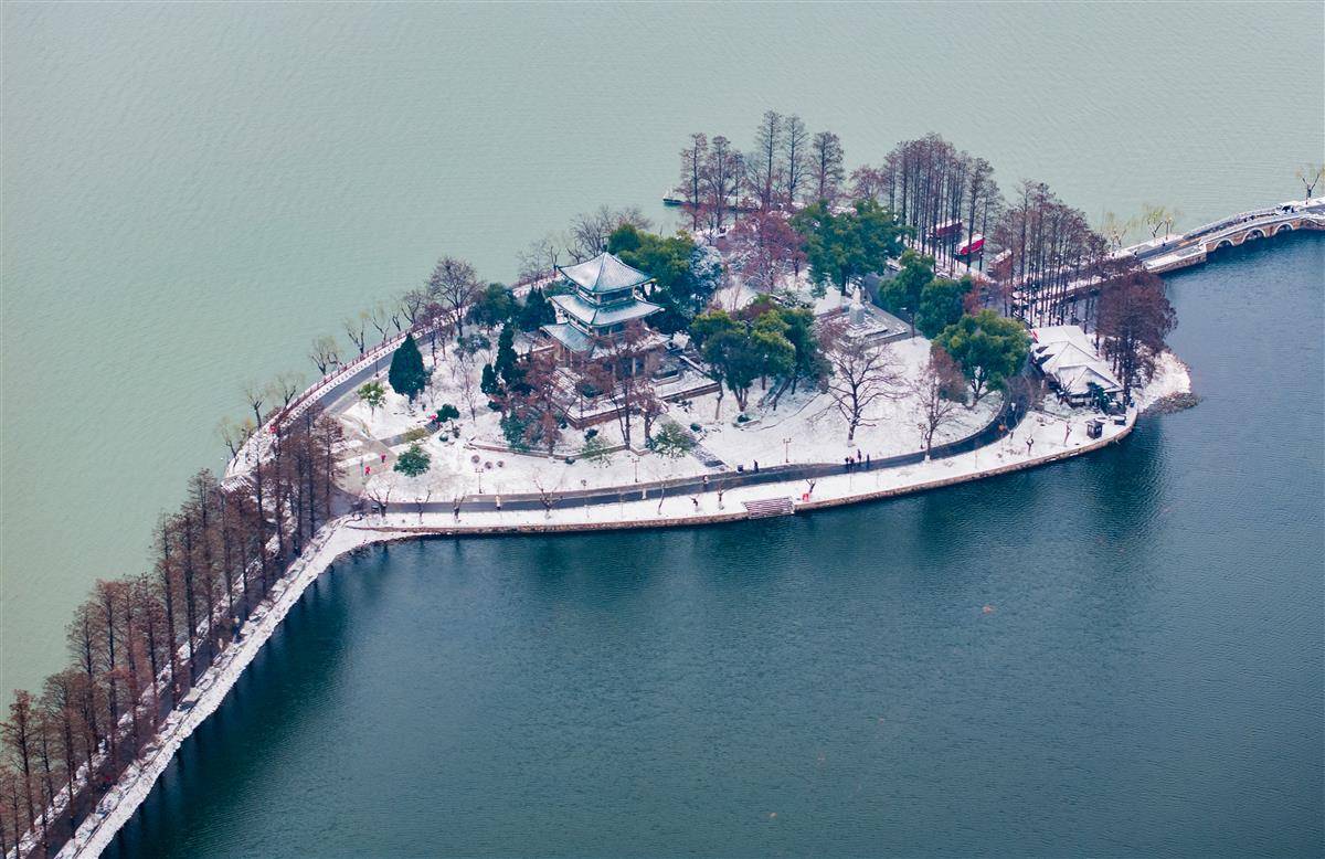 1 月 20 日,武汉大雪为东湖换了新装!上帝视角俯瞰这片城市秘境,银装裹住湖岸线,楚风亭台的朱红与白雪撞出惊艳底色,梅枝缀雪吐暗香,湖心小岛在薄雾中若隐若现。整座东湖化作流动的水墨长卷,每一帧都是冬日限定的浪漫与壮阔。(湖北日报全媒记者 柯皓 摄)