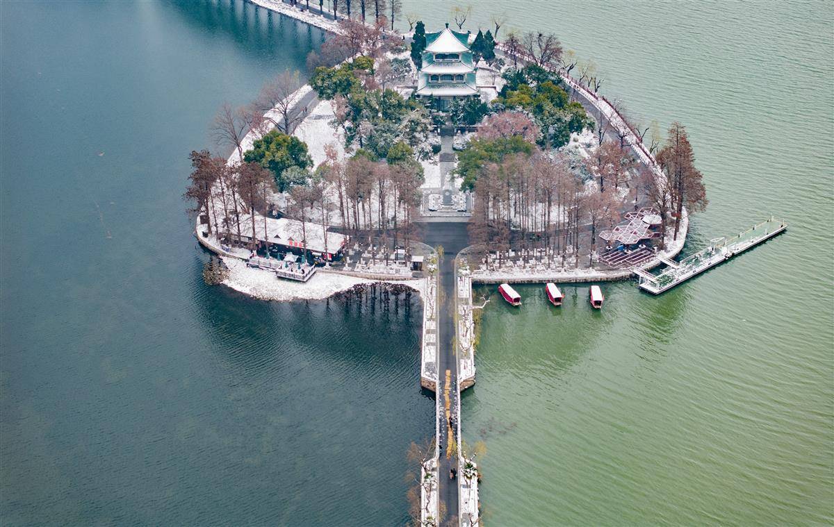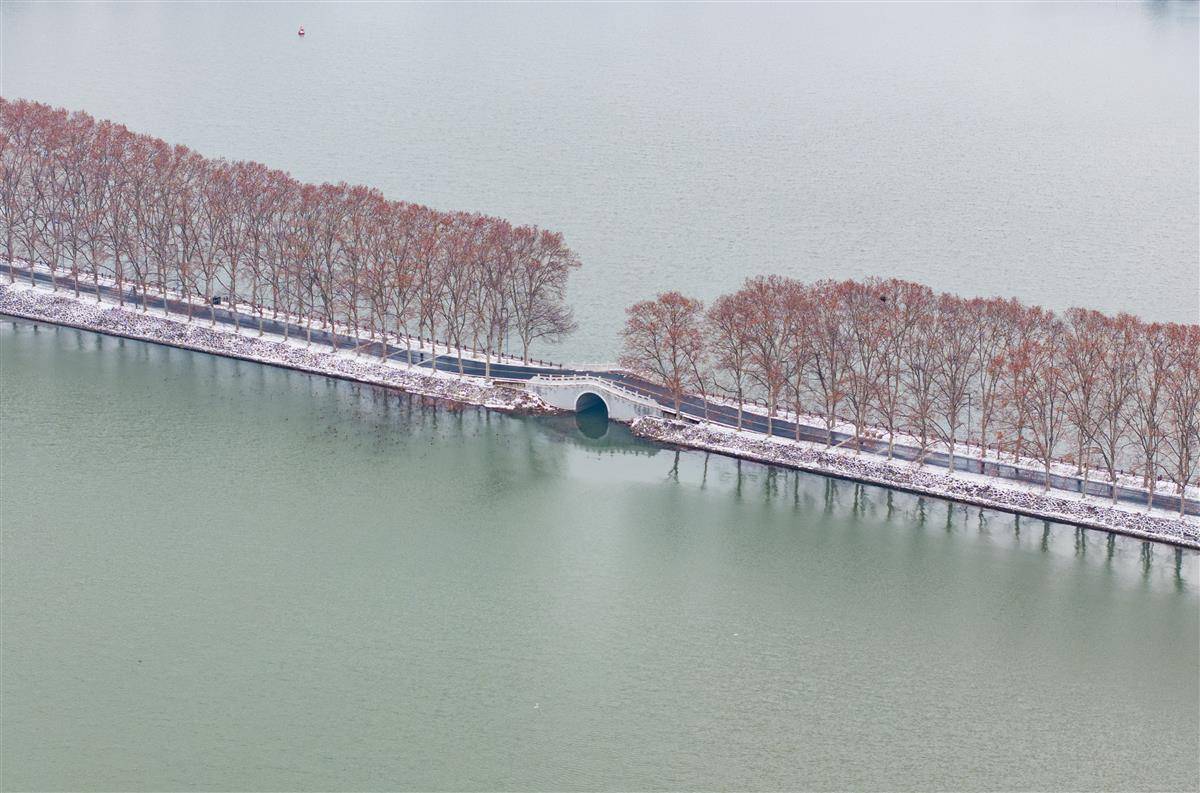 1月20日,航拍雪后武汉东湖美景。(湖北日报全媒记者 柯皓 摄)