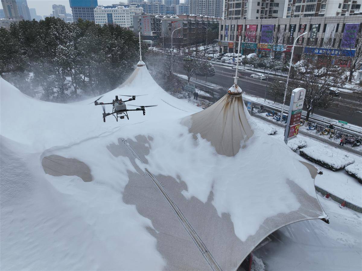 面对永嘉加能站斜拉膜罩棚因积雪可能引发的安全隐患,片区经理付立涛协调采用大型农用无人机进行除雪作业。无人机悬停在罩棚半空,双螺旋桨产生的强劲气流如无形扫帚,仅用1个小时便将400平方米罩棚积雪清扫一空。这种创新的除雪方式,既避免了人工攀爬的安全风险,又提升了多倍的作业效率。在积雪较多的襄西等站,还请来铲车,帮助铲除积雪,为加能站安全运营保驾护航。
