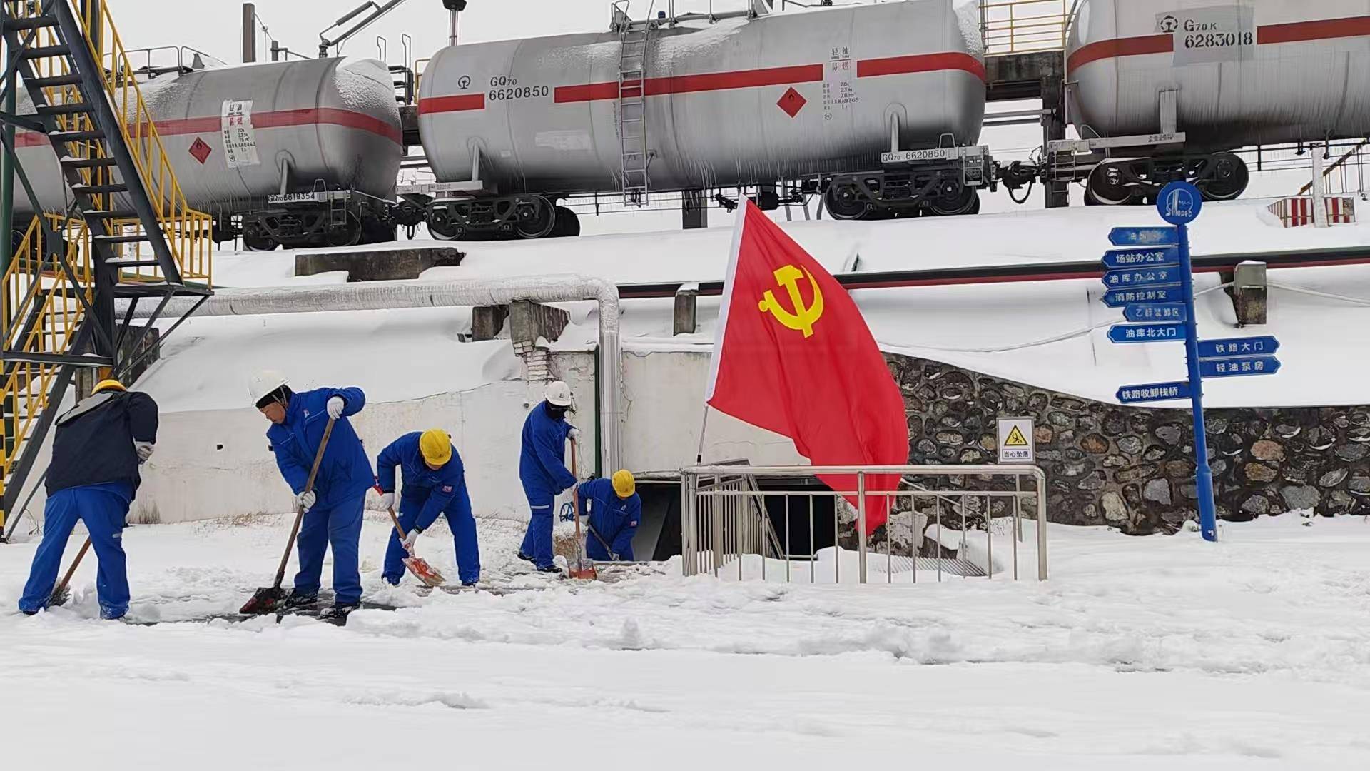 在余家湖油库,一夜的积雪超过了15厘米,油库党支部12名党员带领青年员工组建党员突击队,挥锹舞帚,撒盐铺毯,连续奋战2小时,率先打通1.2公里主干道和6个关键发油鹤位,为保供赢得宝贵时间。面对早上9点前的汽油紧急配送任务,党员骨干全程护航,确保油罐车安全进出,实现发油零延误。