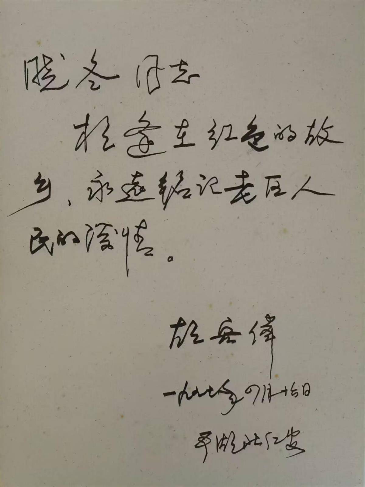 第一次来到红安的胡宏伟,对红安革命历史如数家珍。他说,英雄的红安走出来了三支红军主力。我们沈阳军区老首长张竭诚、张天恕、贺健、赵鹤亭、汪浩等就是红安人。采访结束,胡宏伟为我写下了诗一般的留言“相逢在红色故乡,永远铭记老区人民的深情!胡宏伟 一九九七年四月十六日 于湖北红安”
