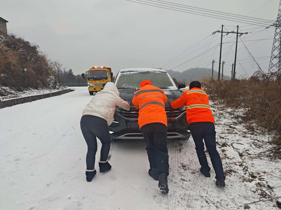 路鑫、田明双合力将受困车辆缓缓推至路侧安全地带