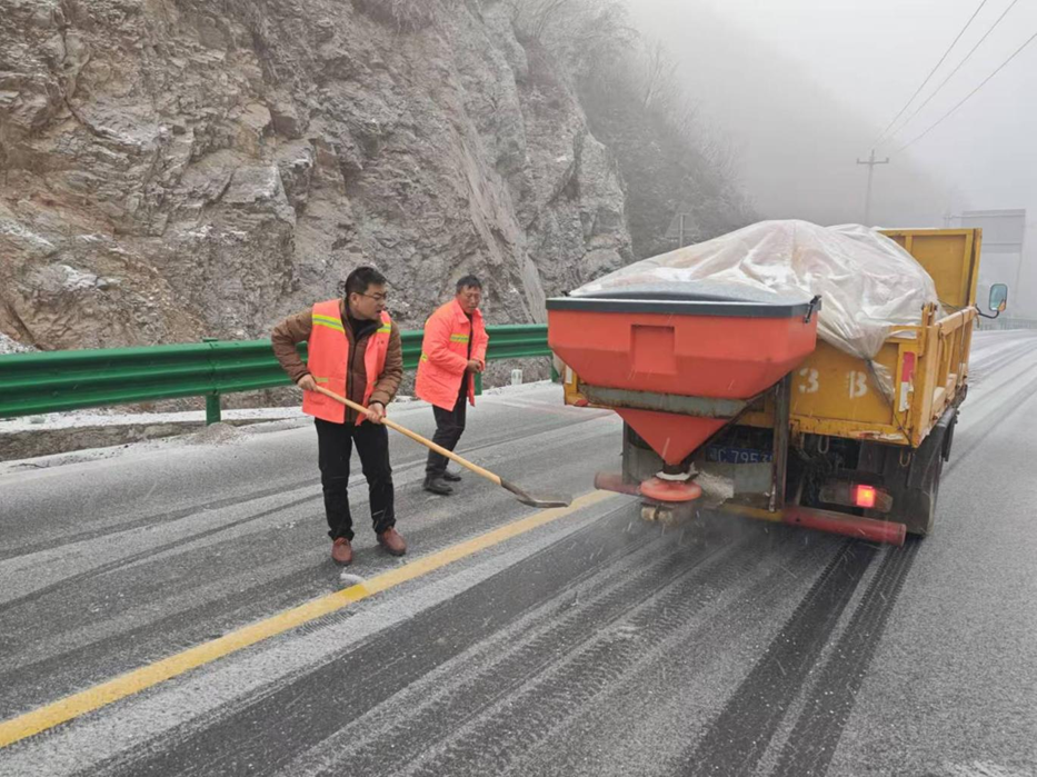气温降至零下5℃,呵气成霜,但他始终在蜿蜒的高寒山路上来回巡查,不放过任何一处险情。一旦发现积雪结冰,便立即调度双掌、六郎道班的养护人员,迅速开展融雪剂撒布作业。天光渐亮时,张卓和同事们倚着工程车稍作休憩。身后,是他们用一夜坚守换来的畅通无阻的观大线。