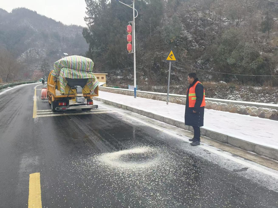 1月21日,在丹江口海拔1100米的S279石青线盐万段,丹江口市公路养护公司副经理刘天林带领队员驻守在这条公路上已有3天。他顶着寒风对弯道、坡道等易结冰点位反复撒布融雪剂,带领队员配合除雪车、撒布机高效作业。