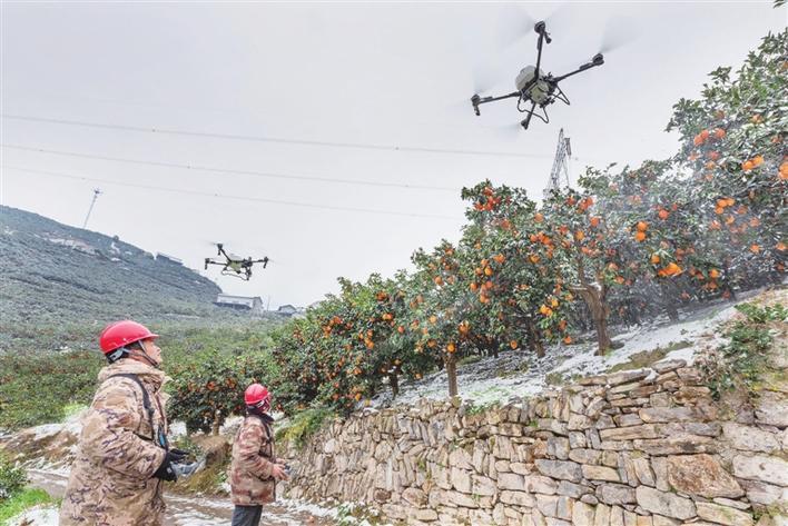 郭家坝镇组织社会化服务组织操作无人机对柑橘树上的积雪进行清除作业。 通讯员 彭强 摄