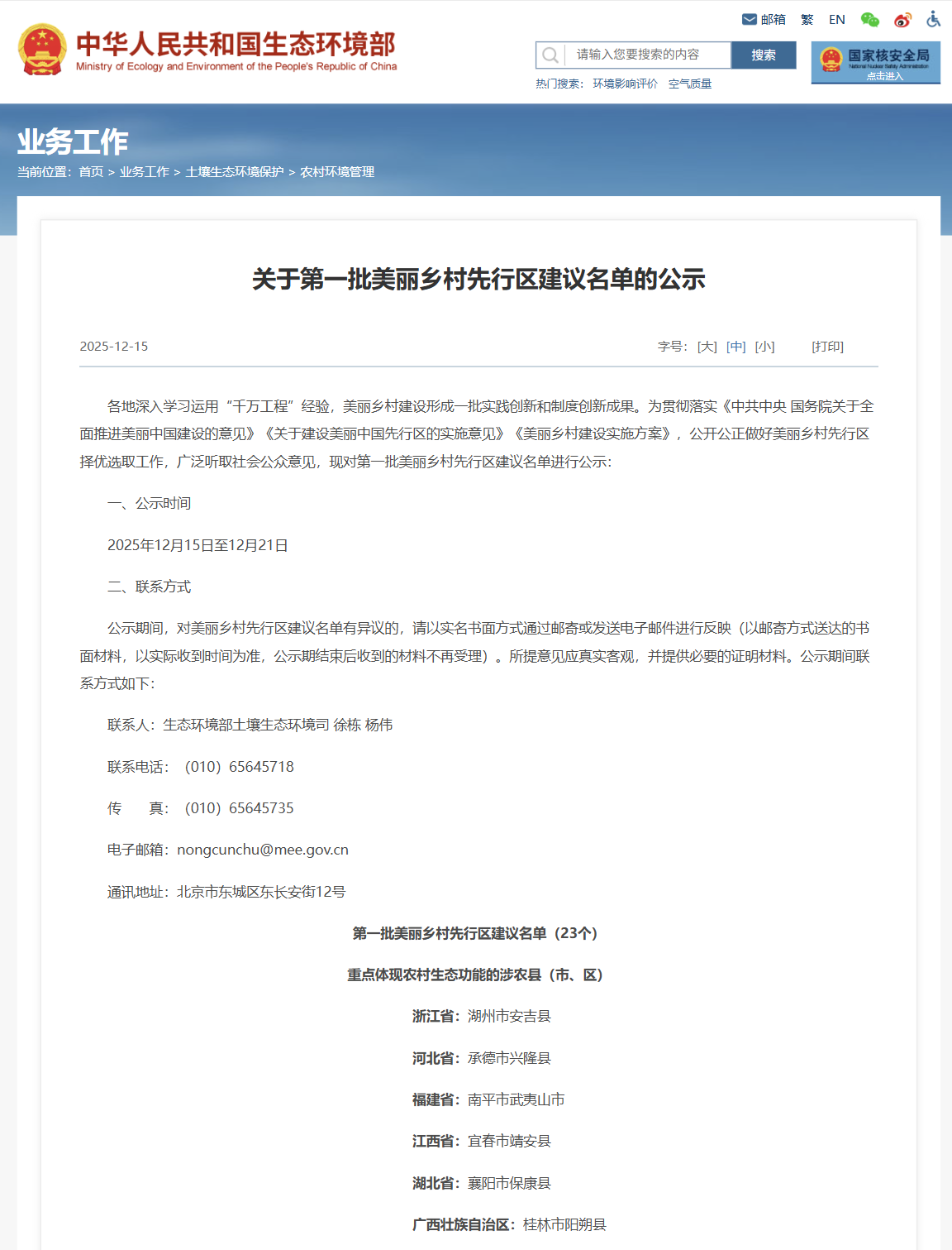 湖北日报讯(记者吴宇睿、通讯员李丹、赵月)1月21日,生态环境部公布第一批美丽乡村先行区名单,保康县作为湖北省唯一入选的县(市、区),与浙江安吉、福建武夷山等全国23个县(市、区)共同获此殊荣。