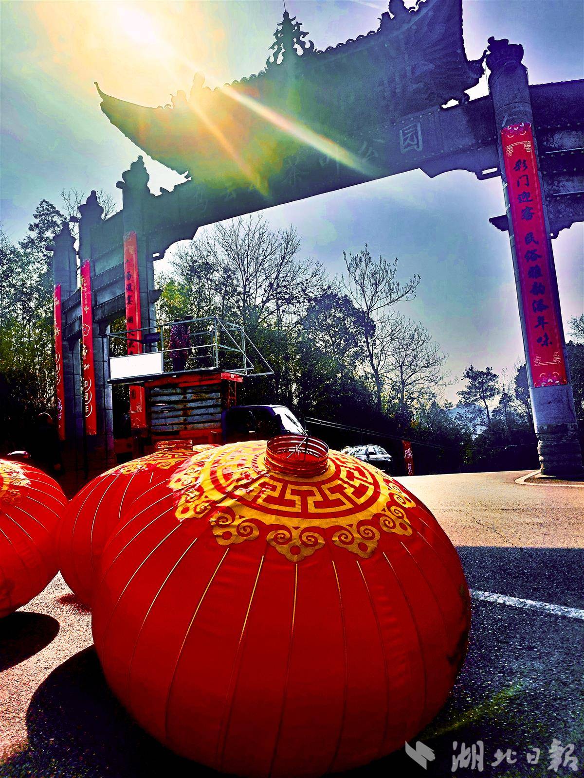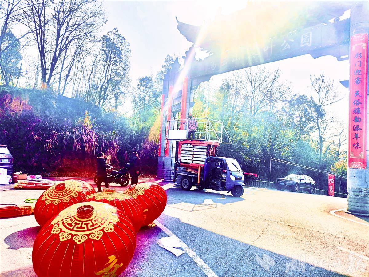 湖北日报讯(通讯员付向阳)春节将至,年味渐浓。1月22日,在英山县乌云山茶叶公园,工人在给公园大门安装大红灯笼,红红的灯笼让整个公园红了起来,处处洋溢着喜庆、祥和的节日氛围。茶山上红梅绽放,整个公园叶装点得五彩斑斓,令人赏心悦目。
