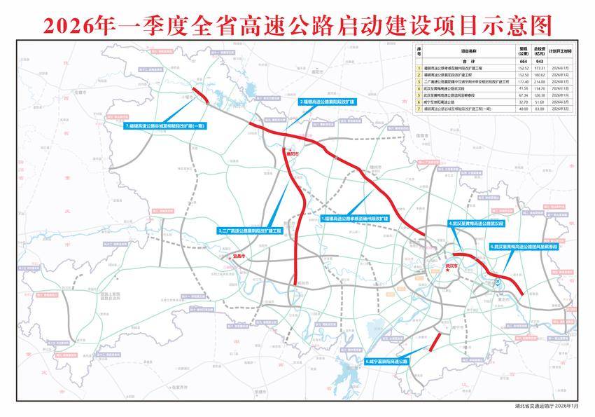 省交通运输厅介绍,今年一季度将有7条高速公路相继动工,总投资970亿元,建设总里程665公里,推动湖北经济增长实现良好开局。7个项目包括福银高速的3段改扩建工程、二广高速改扩建工程、武汉至黄梅高速公路以及咸宁至崇阳高速公路等,是湖北省“铁水公空”多式联运体系建设的代表性项目,也是链接汉襄宜“金三角”高速公路主通道提质扩容的重点项目,对推动武汉都市圈高质量发展、打造国家综合立体交通网主骨架具有重要意义。