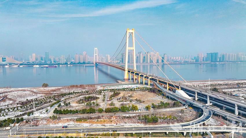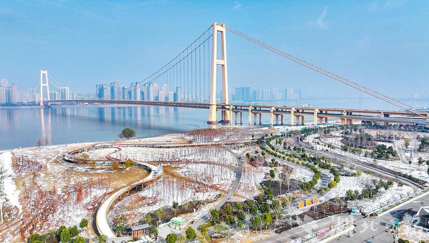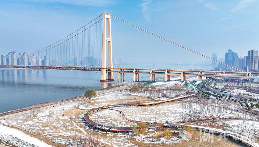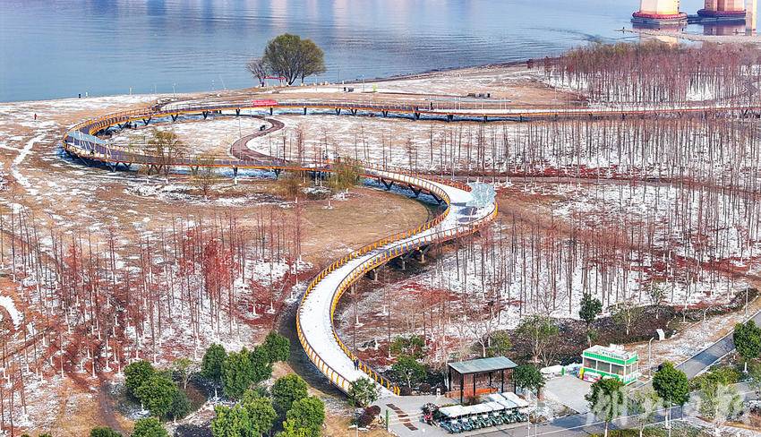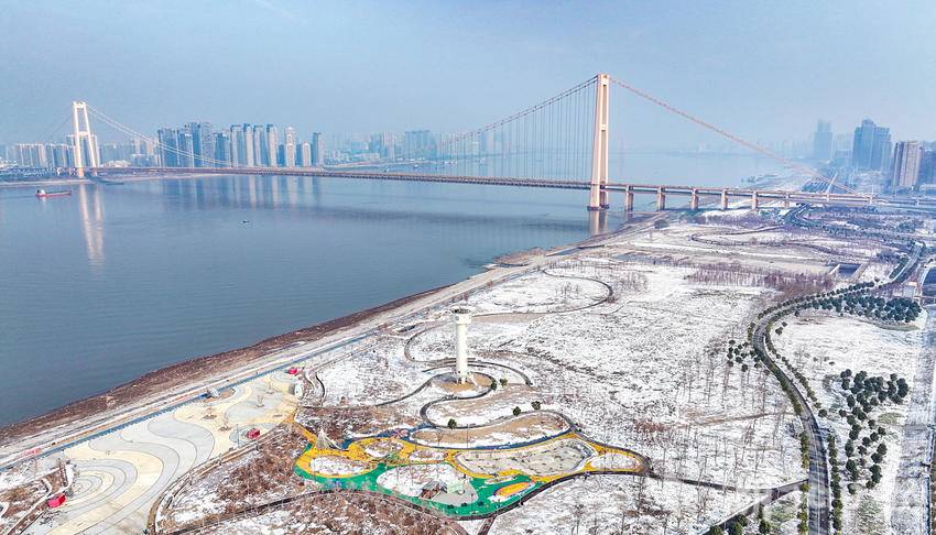 1月22日上午,鸟瞰武汉洪山江滩公园,阳光之下,冰雪开始快速融化,林荫小道、栈道、草地等逐渐恢复原来的模样。当日,大雪后的武汉迎来了明媚的阳光,虽然部分路段仍然有少量积雪和冰凌,但经过连续两天的清理和融化,已经不会对交通造成太大影响。(湖北日报全媒记者 朱熙勇 摄)