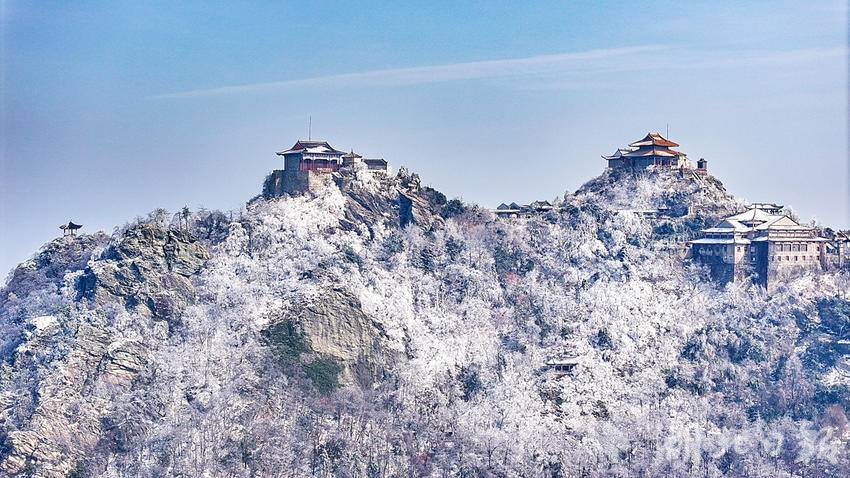 1月22日,鸟瞰银装素裹的武汉黄陂区木兰山。阳光上线,雪中木兰,诗情画意,蓝天为幕,一草一木在白雪映衬下更为雅致。(湖北日报全媒记者 朱熙勇 摄)
