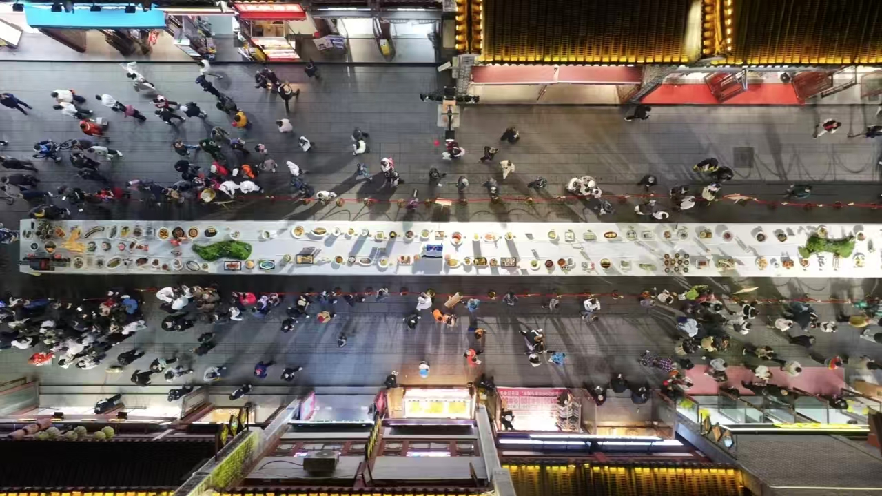 美食与旅途紧密交织,共同构成一段难忘的体验。2025年11月15日,“知音湖北 超级文旅日”17寻味荆楚之逛襄阳吃江湖活动在北街火热开启。百米长桌宴沿街铺展,成为古城最吸睛的风景线,百米长桌宴不仅有看头、有说头,还有满口江湖滋味。油焖大虾、襄阳缠蹄、龙王烧鹅……地道风味勾起游客的味蕾。