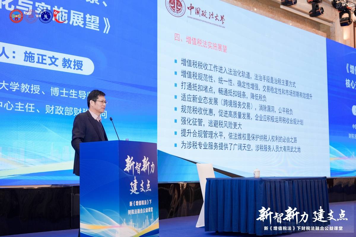 当日,湖北省新的社会阶层人士联谊会、湖北省注册税务师协会、湖北省律师协会、湖北省注册会计师协会联合主办的新智新力建支点——新《增值税法》下财税法融合公益课堂开讲。中国政法大学教授、博导、财税法研究中心主任、财政部财税顾问施正文以《增值税立法背景、核心变化与实施展望》为题进行分享。施正文系统梳理了立法进程,深入剖析了新旧法条差异与核心要点,并就新法对市场生态及专业服务的深远影响进行了前瞻性解读。其权威、透彻的讲解,为与会者提供了清晰的政策导航和坚实的理论支撑。