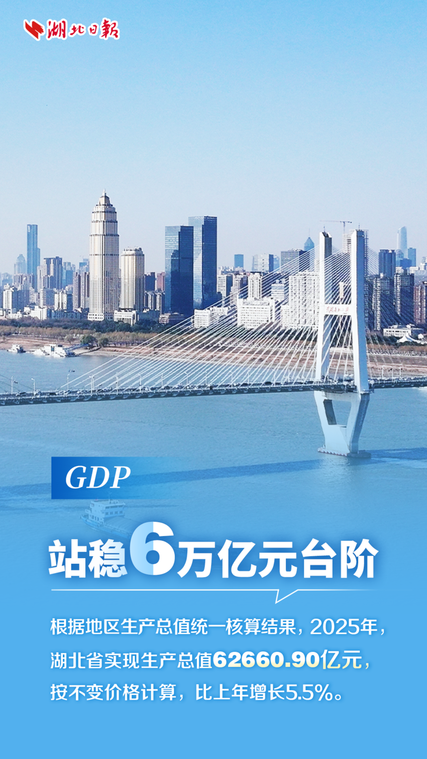 湖北日报讯(记者谢慧敏)1月23日,湖北省统计局、国家统计局湖北调查总队发布2025年湖北经济运行情况:根据地区生产总值统一核算结果,2025年,湖北省实现生产总值62660.90亿元,按不变价格计算,比上年增长5.5%。