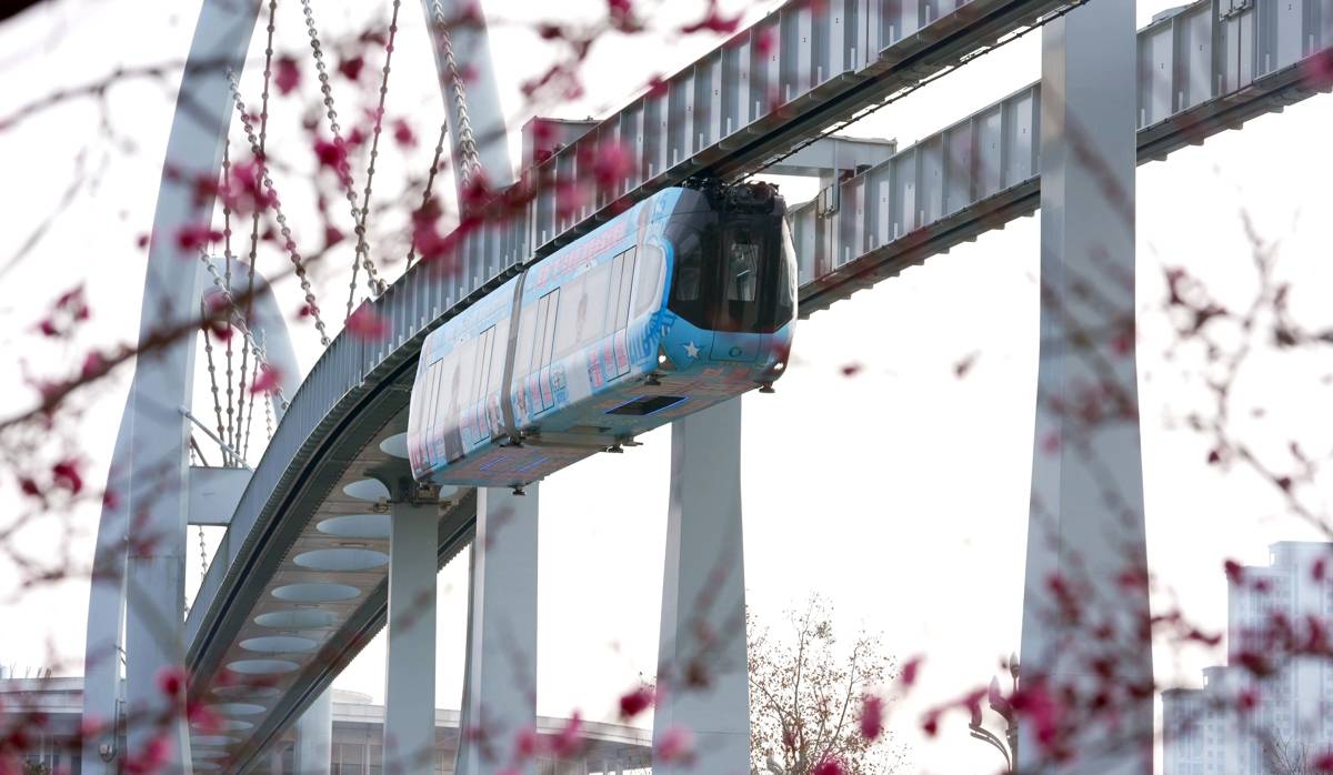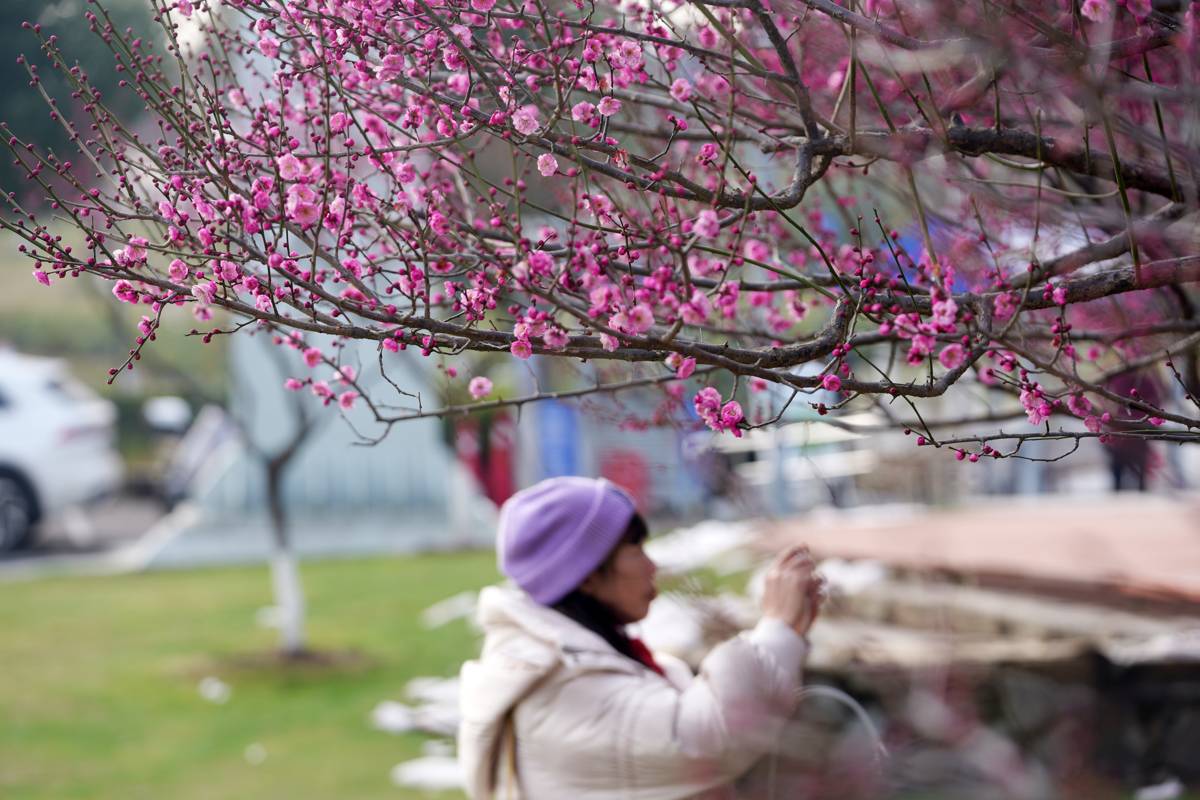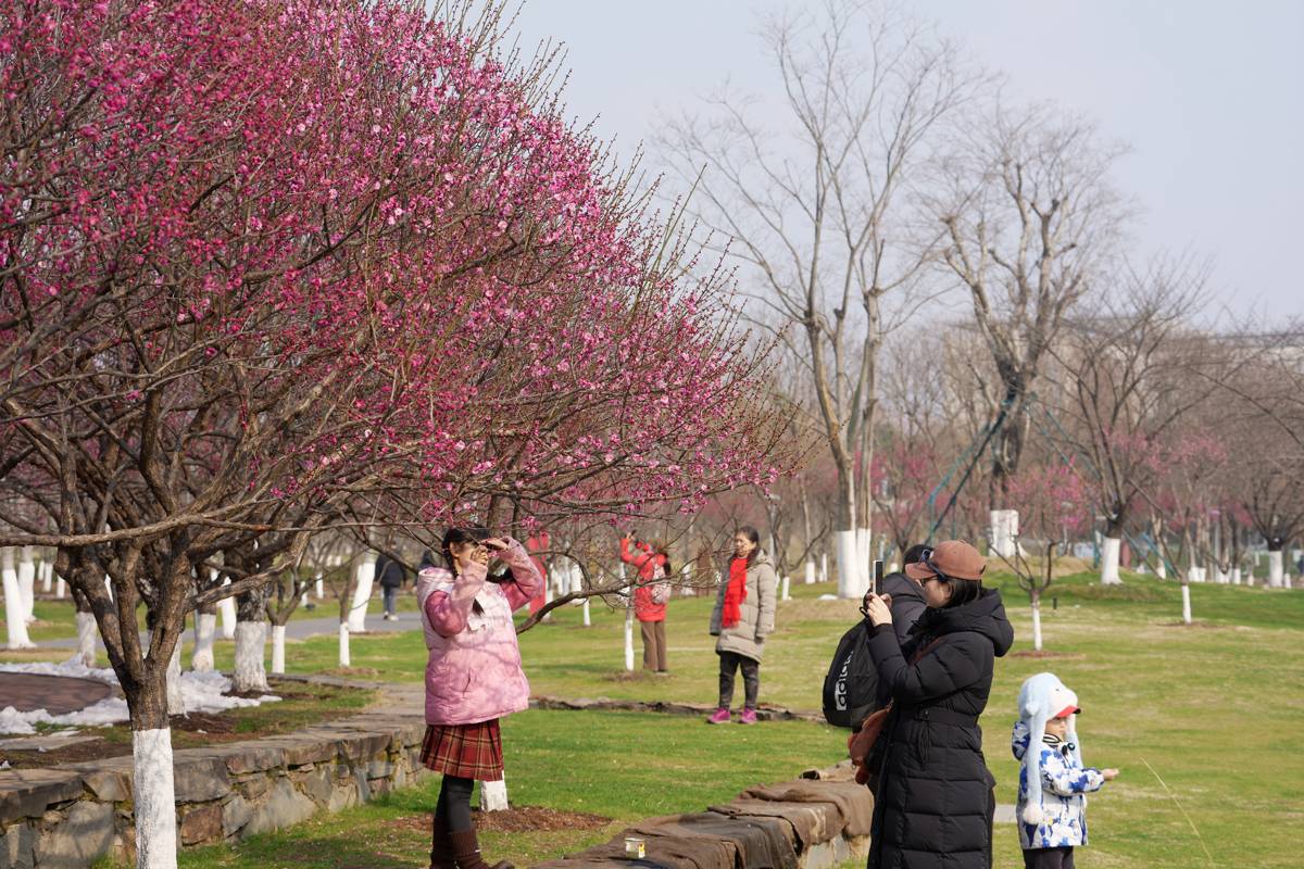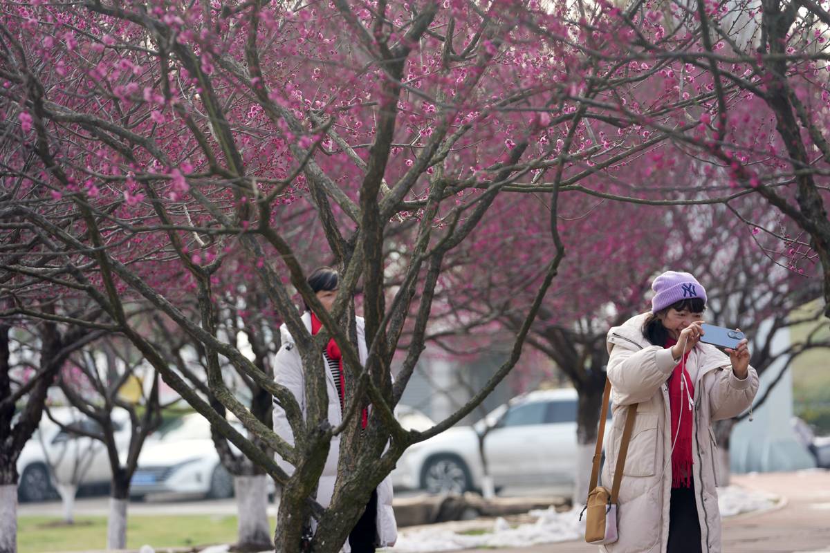 1月22日,武汉东湖高新区西苑公园,市民在空轨下赏梅、打卡。近日,武汉园林部门发布的“2026年赏梅地图”中,全市116座城市公园被标注为赏梅好去处,其中39座公园种植梅花超百株,10座公园梅树数量超过500株。近年来,“春赏樱、夏看荷、秋品桂、冬观梅”,四季繁花轮番登场江城。伴随着城市更新和“湿地花城”建设,武汉每年新、改建公园百余座。在新公园建设、老公园升级过程中,市、区园林和林业部门有意识地种上梅花,强化“冬观梅”的城市四季花卉特色。(湖北日报全媒记者 魏铼 摄)