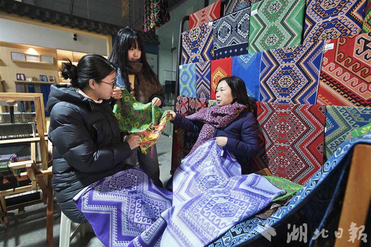 1月22日,在恩施州西兰卡普生产基地内,传承人田若兰正在向两名进行社会实践的大学生讲解新技术与传统织法的区别。