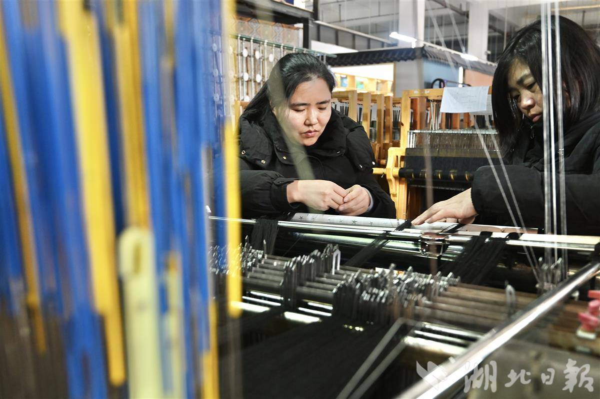 1月22日,恩施州西兰卡普生产基地内,传承人田若兰正在改良织机前查看双面织锦生产情况。