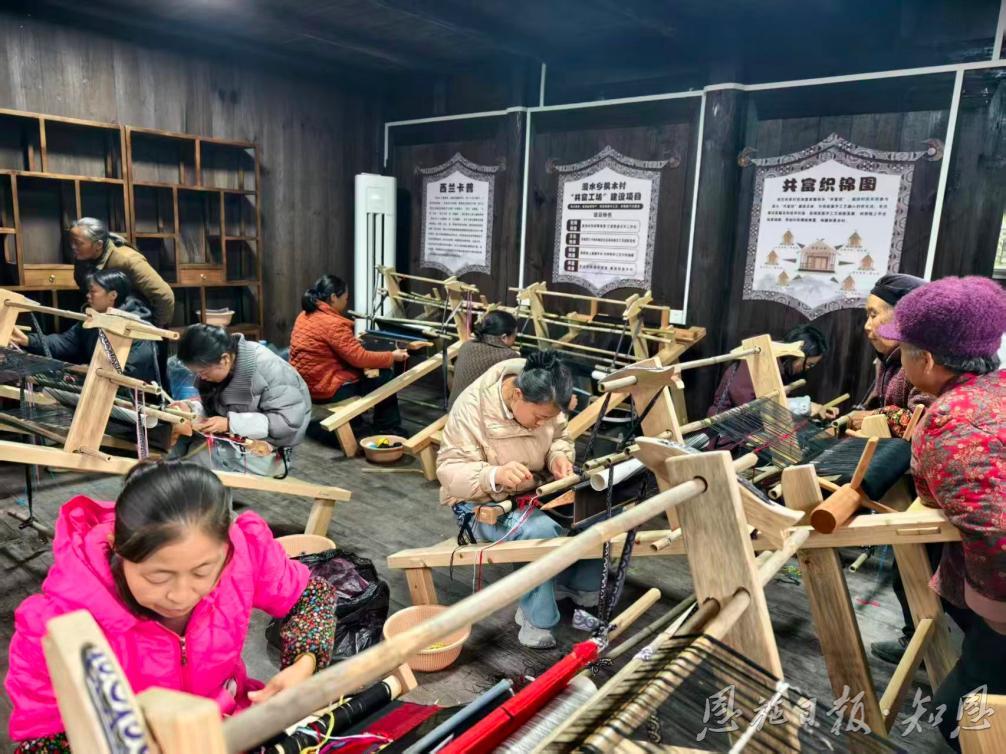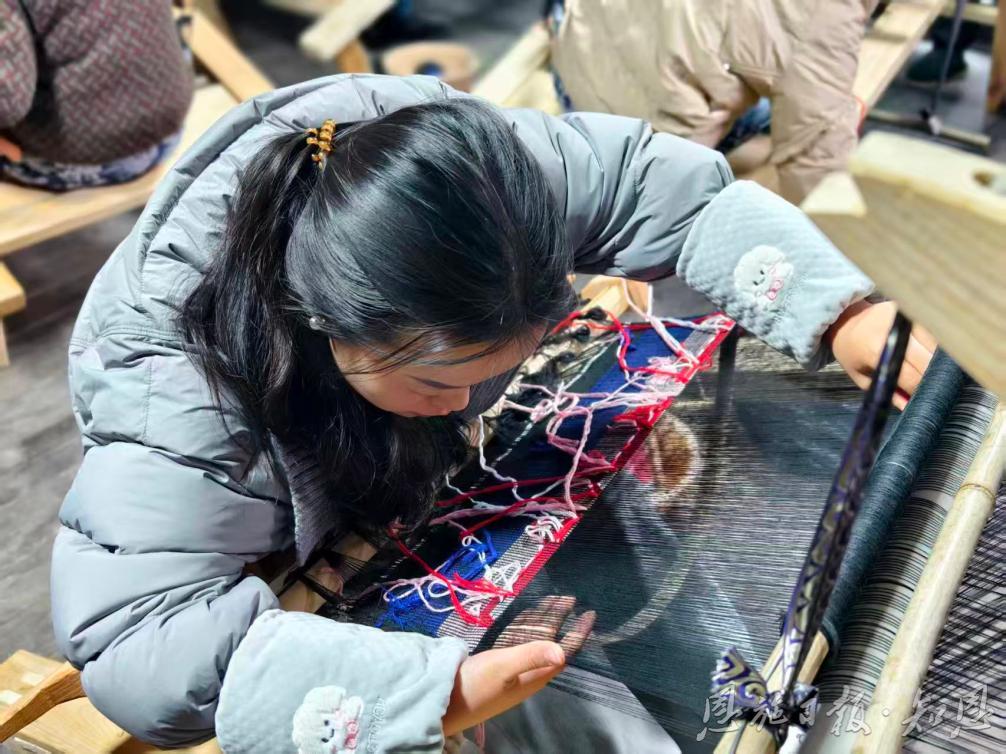 冬日的鄂西山区,寒意渐浓。1月20日,走进来凤县漫水乡枫木村柳家坡,一栋挂有“共富工坊”木牌的房屋内却暖意融融。咔嗒、咔嗒……整齐的织布声如溪水轻鸣,三台传统木制织机前,村民廖芳婷、丁欣蓉、柳秋月正全神贯注地俯身忙碌,彩线在指尖与经纬间穿梭,逐渐显现出土家族传统纹样——这是已有几千年历史的西兰卡普织锦技艺。