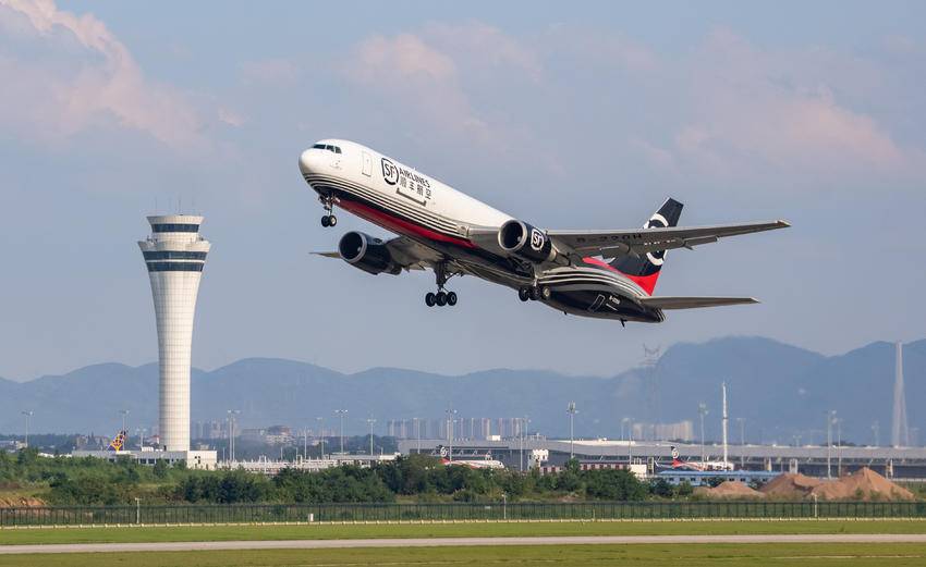 一架货机从鄂州花湖国际机场起飞。(湖北日报全媒记者 薛婷 摄)