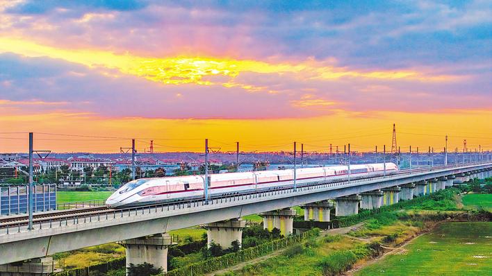 2025年10月22日,一列CR450BF动车组行驶在沪渝蓉高铁汉川北站至荆门西站区间。 (湖北日报全媒记者 柯皓 摄)