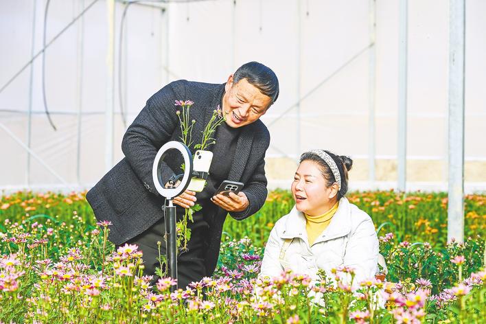 1月15日,在浠水县湖北锦润生态农业有限公司鲜花种植基地大棚内,返乡创业能人在直播销售鲜花。(视界网 王江 摄)