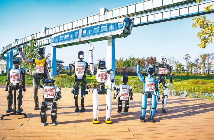 2025年11月4日,武汉光谷中央生态大走廊,人形机器人为光谷马拉松预热助威。 (湖北日报全媒记者 魏铼 摄)