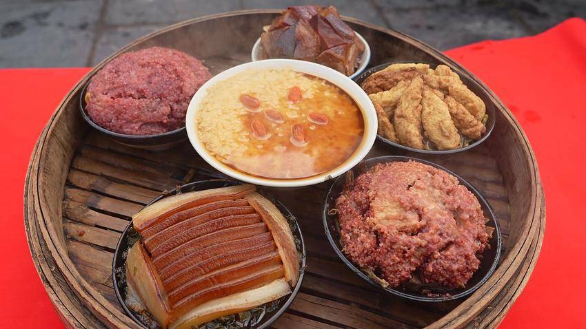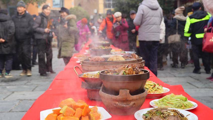 “百家宴”是年货节的传统亮点,在五山镇已有悠久历史。今年,堰河村干部群众精心烹制了八百多道本地传统菜肴,组成丰盛的“腊八百家宴”,免费供游客品尝。五山八大碗、碳锅腊蹄、黄精土鸡汤、红烧土猪肉等美食,让游客们围坐一堂,尽情享用,真切感受到茶乡人的热情。