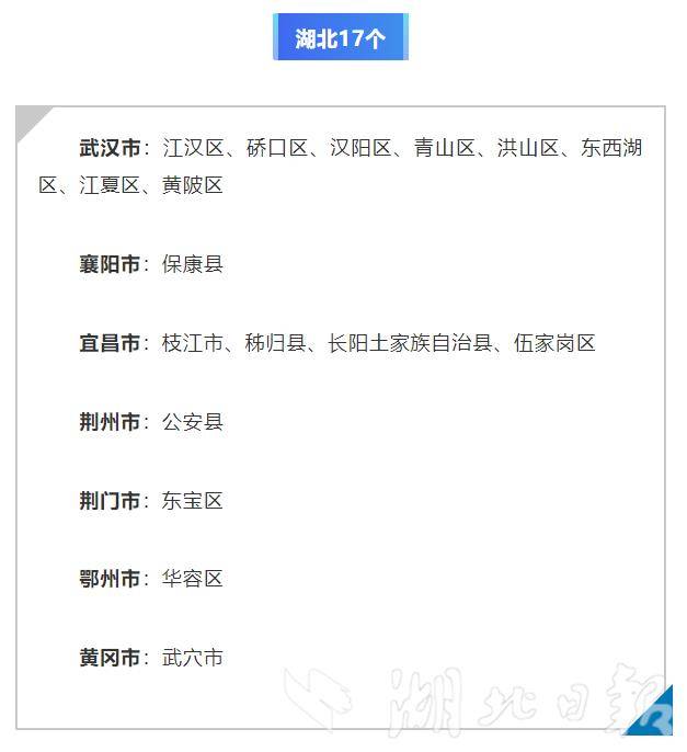 我省此次通过首批认定的地区包括:武汉市江汉区、硚口区、汉阳区、青山区、洪山区、东西湖区、江夏区、黄陂区;襄阳市保康县;宜昌市枝江市、秭归县、长阳土家族自治县、伍家岗区;荆州市公安县;荆门市东宝区;鄂州市华容区;黄冈市武穴市。
