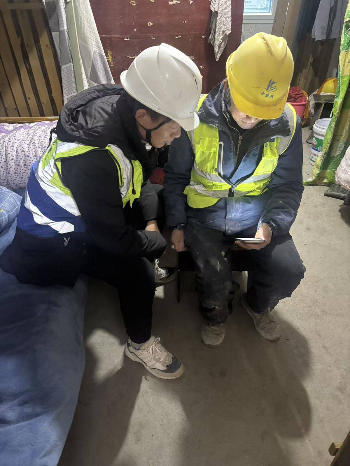工友在一起查看“百工聚”APP。(受访单位供图)