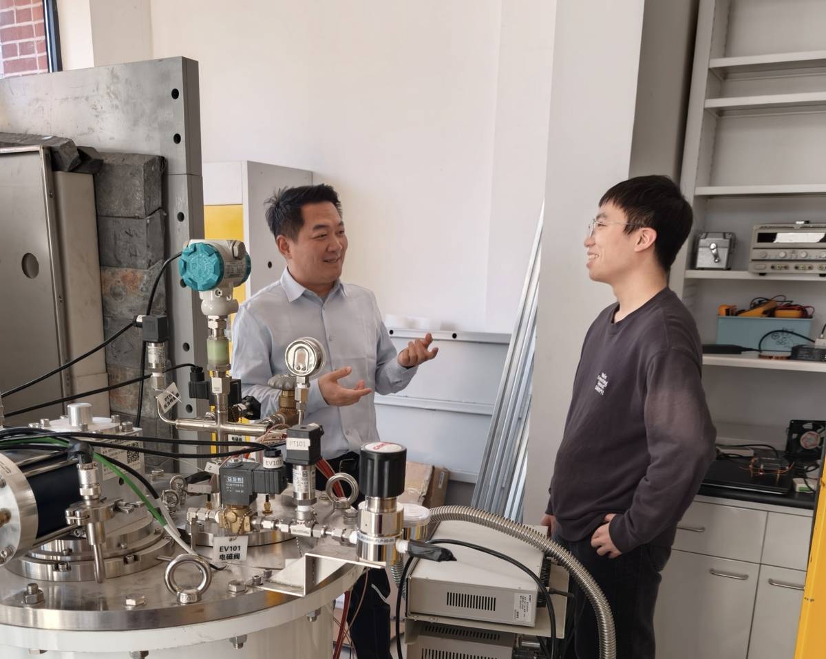 刘倩(左一)和左杰(右一)讨论实验。(受访者供图)