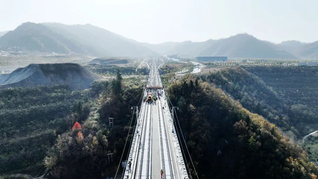 2025年11月27日,随着最后一对500米长钢轨在西十高铁湖北段神定河大桥上平稳铺设就位,西安至十堰高速铁路全线铺轨施工圆满完成,为线路开通运营奠定坚实基础。(视界网 刘昆 摄)