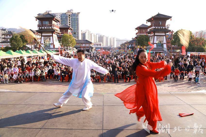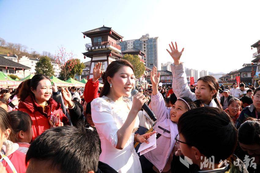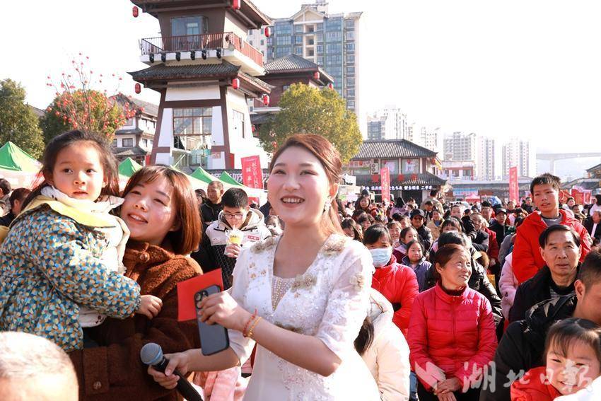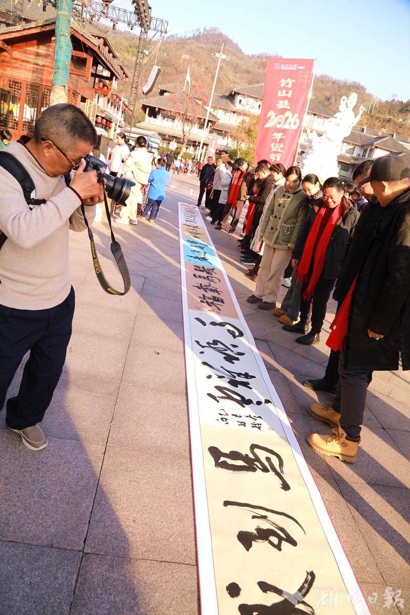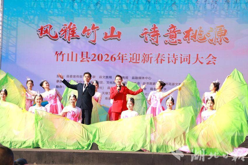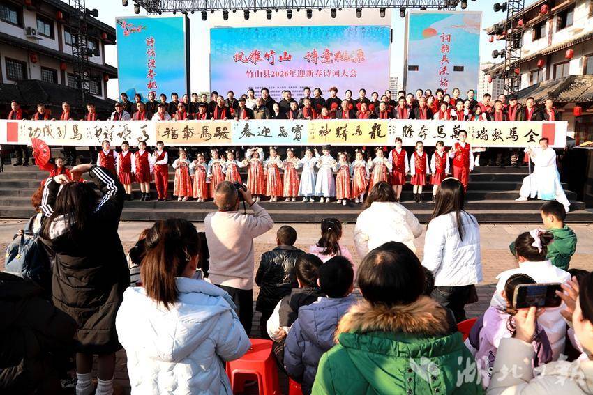 湖北日报客户端讯(通讯员陈昌荣、陆龙和)诗藏万卷书山,礼承千年智慧。1月24日,上庸古城——竹山县城关镇桃花源女娲文化广场,一场以“风雅竹山 诗意桃源”为主题的新春诗词大会,在欢腾的年味中拉开帷幕。线上线下的数千名观众,共赴这场穿越时空的诗词盛宴,在“万货潮集”的热闹中,感受墨香与年味的交融。