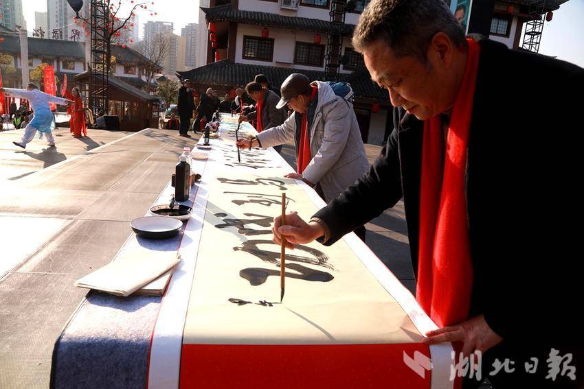 本届大会由县委宣传部、县文联等部门联袂打造,以“破圈”之姿创新传统表达,让古典诗情与现代艺术碰撞出火花。诗朗诵《这就是竹山》以声为笔,将层峦叠翠、碧水蜿蜒的故乡画卷徐徐铺展;诗词情景剧《木兰辞》则鼓角铮鸣,旌旗猎猎,带观众直抵金戈铁马的沙场,见证巾帼英雄的飒爽英姿;非遗秀《裙幄之宴》衣袂翩跹间,唐时风雅跃然眼前,仿佛将千年前的长安夜宴搬至堵河畔。而书画与太极的跨界演绎《骏马春风意 墨舞竹山春》,更是一场视觉与哲思的双重盛宴,书法家笔走龙蛇,墨迹如骏马奔腾,八位本土书法家合力挥毫,十余米长的贺岁横幅一气呵成,墨香裹挟着祝福送给观众;太极师行云流水,招式似春水荡漾,刚柔相济间,尽显东方美学的从容气度。