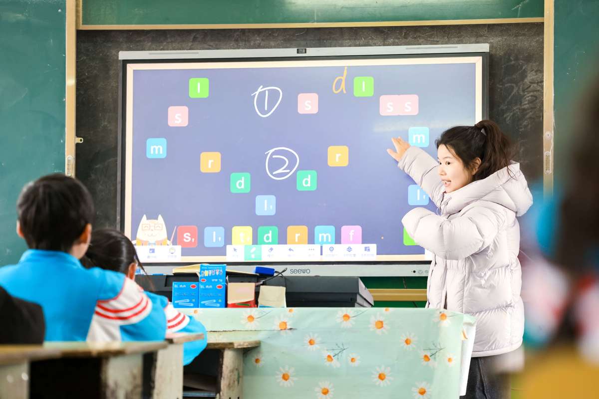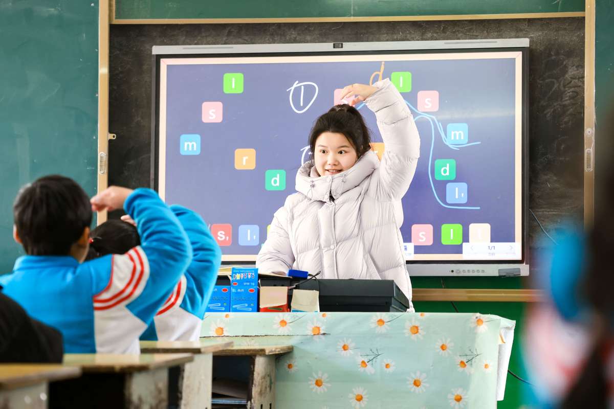 2025年麻城市第二实验小学核心校音乐教师吴雨筝交流到对口乡村校——张家畈镇黄市校区,成为首位专职音乐教师,并组建了一支合唱团。图为吴雨筝利用柯达伊教育法向该校四年级学生教授音乐课。(湖北日报全媒记者 成熔兴 摄)
