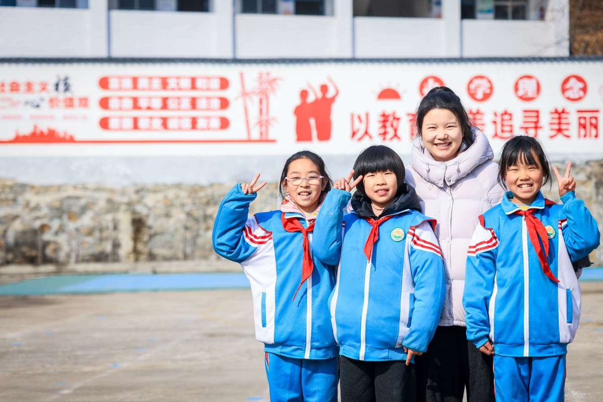 2025年麻城市第二实验小学核心校音乐教师吴雨筝交流到对口乡村校——张家畈镇黄市校区,成为首位专职音乐教师,并组建了一支合唱团。图为吴雨筝与部分合唱团成员合影。(湖北日报全媒记者 成熔兴 摄)