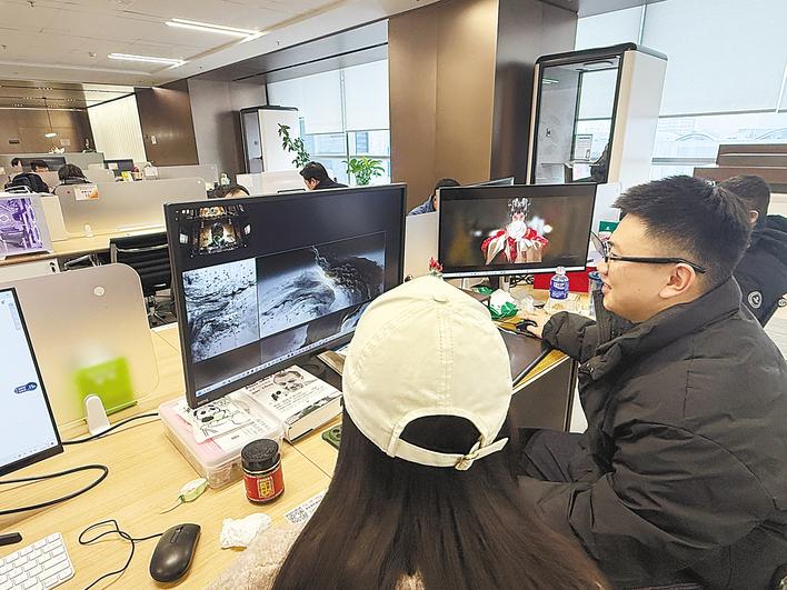 武汉阿里中心的Y/OUR SPACE里,袁超和同事讨论动画制作细节。(湖北日报全媒记者 李源 摄)
