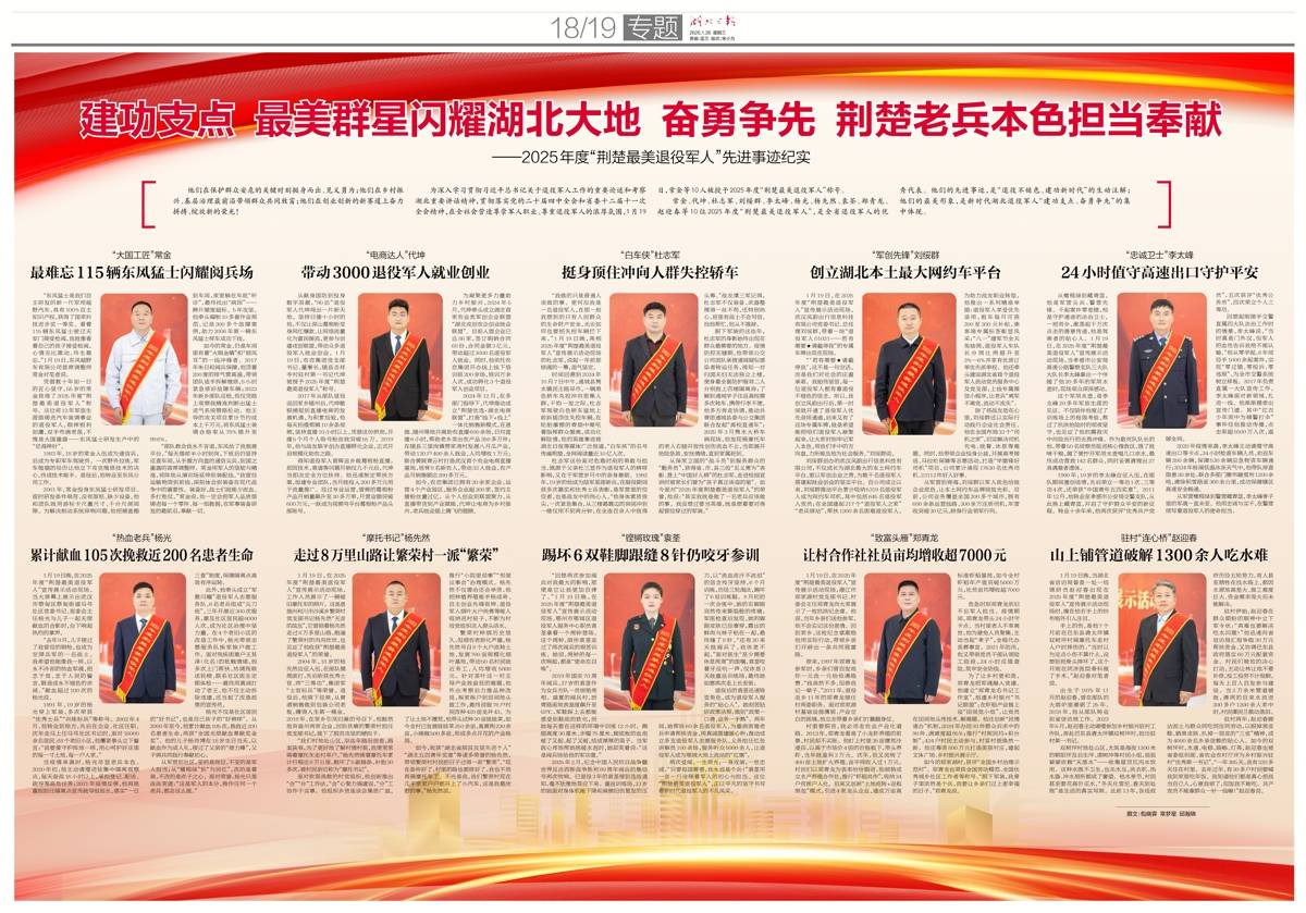湖北日报讯(记者王孝武)2025年1月28日,《湖北日报》第18/19版刊发《建功支点 最美群星闪耀湖北大地 奋勇争先 荆楚老兵本色担当奉献——2025年度“荆楚最美退役军人”先进事迹纪实》报道,讲述了10位2025年度“荆楚最美退役军人”感人故事。