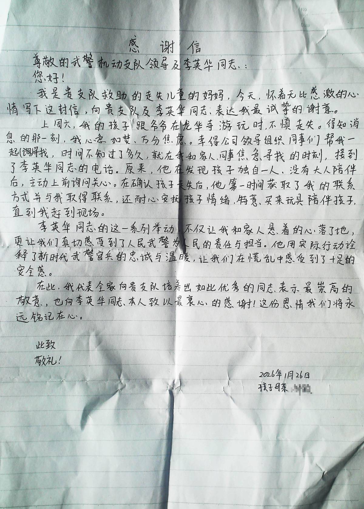 随后,孩子家长多方打听,才知晓好心人是武警机动支队战士李英华。他们将一面锦旗和一封感谢信送至军营,这段暖心故事得以传开。