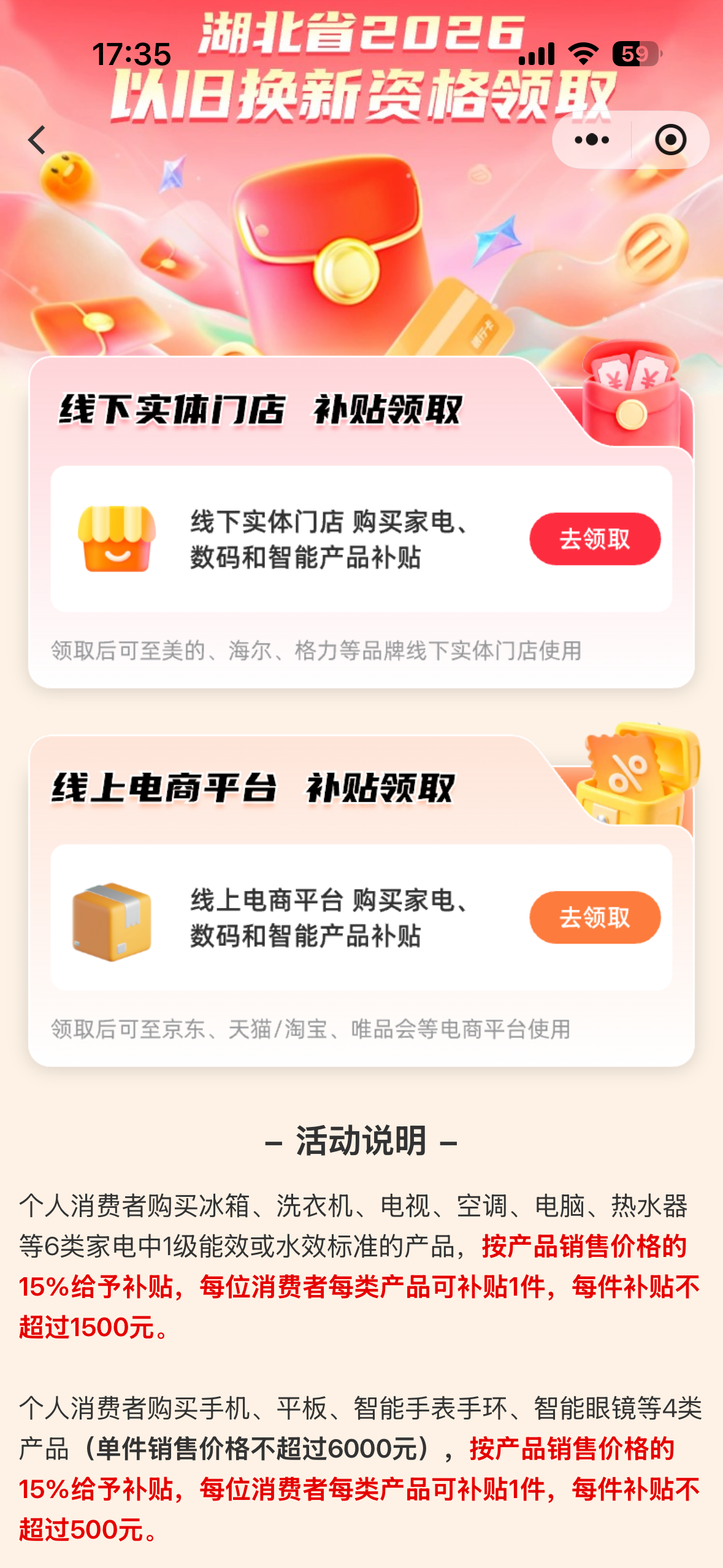 据悉,我省线下渠道以旧换新“国补”已于1月14日在全省17个市州陆续启动,此次线上“国补”正式发放后,消费者可自主选择渠道参与活动。购买冰箱、洗衣机、电视、空调、电脑、热水器等6类家电中1级能效或水效标准的产品,按产品销售价格的15%给予补贴,每位消费者每类产品可补贴1件,每件补贴不超过1500元;购买手机、平板、智能手表手环、智能眼镜等4类产品(单件销售价格不超过6000元),按产品销售价格的15%给予补贴,每位消费者每类产品可补贴1件,每件补贴不超过500元。