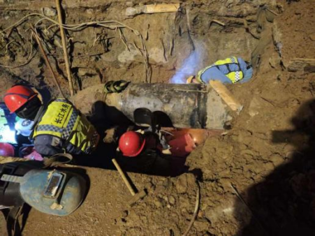 寒夜里,施工人员裹着厚棉衣,指尖冻得发红,却丝毫没有放慢作业节奏。两处主接驳点率先攻坚,吊车稳准吊运管段,焊工们顶着严寒精准对位,他们克服低温对工艺的影响,专注把控每一道焊口的饱满牢固,呼出的白气与烟尘交织。六处支管接驳点同步推进,施工人员分工协作,测量、切割、打磨等工序有条不紊。
