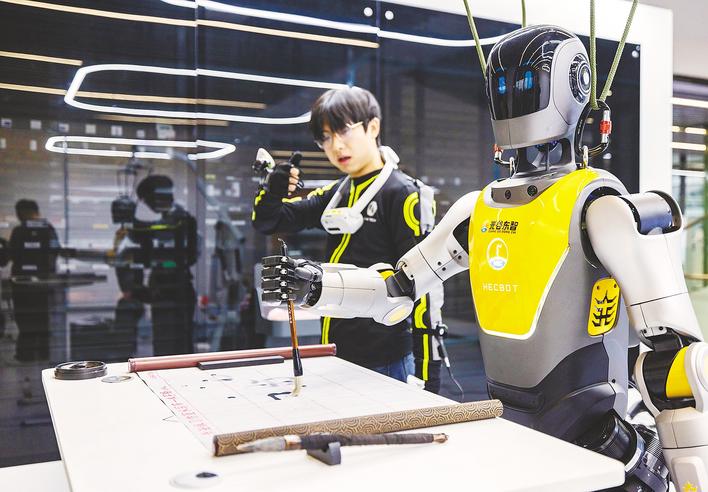 1月19日,湖北人形机器人创新中心内,人形机器人跟着动捕演员训练写字动作。 (湖北日报全媒记者 薛婷 摄)