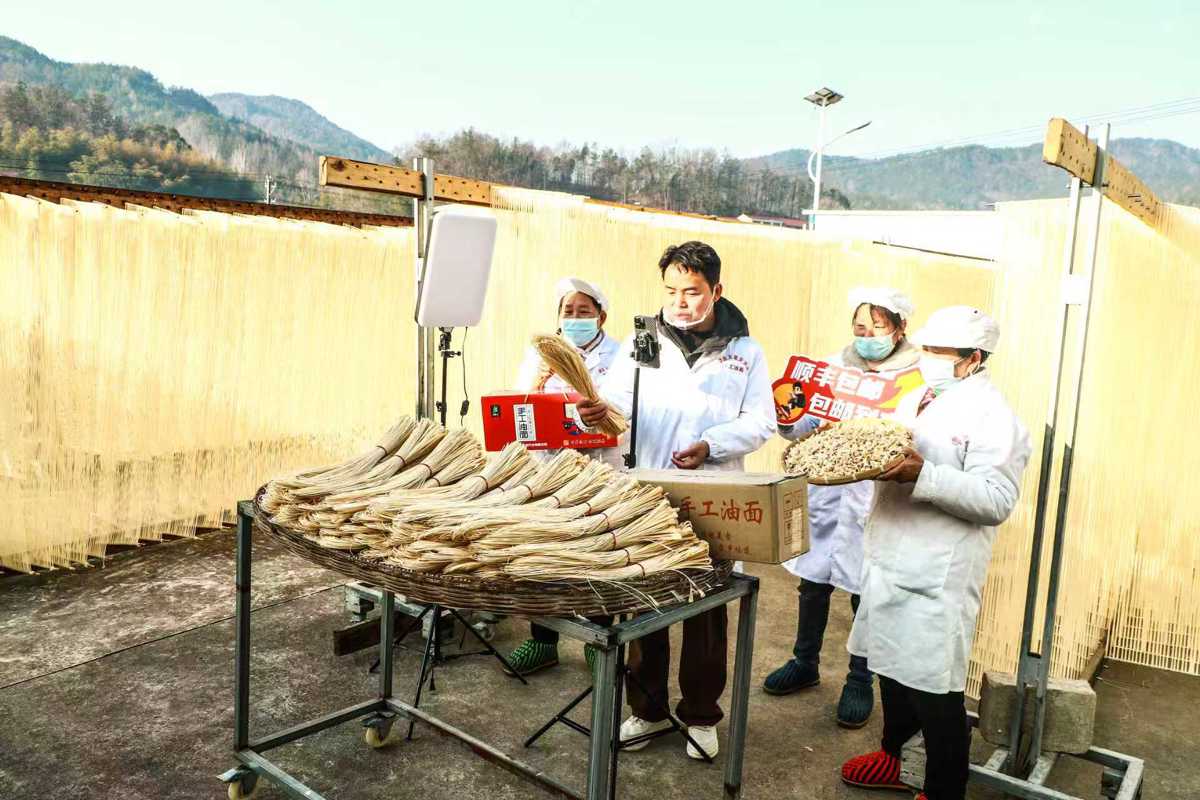 湖北日报讯(通讯员 付向阳)春节临近,在英山云上打年货的订单络绎不绝,走进位于该县的玉皇尖农业,红彤彤的腊肉、腊肠看着就非常诱人。金黄细长的手工油面幽香四溢,现场直播制作场景,热闹非凡。电商直播助力“山货出山”,给回乡创业的英山人带来实实在在的收益。
