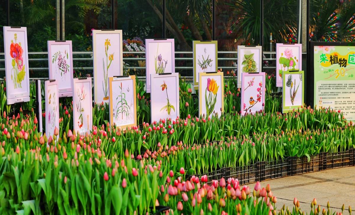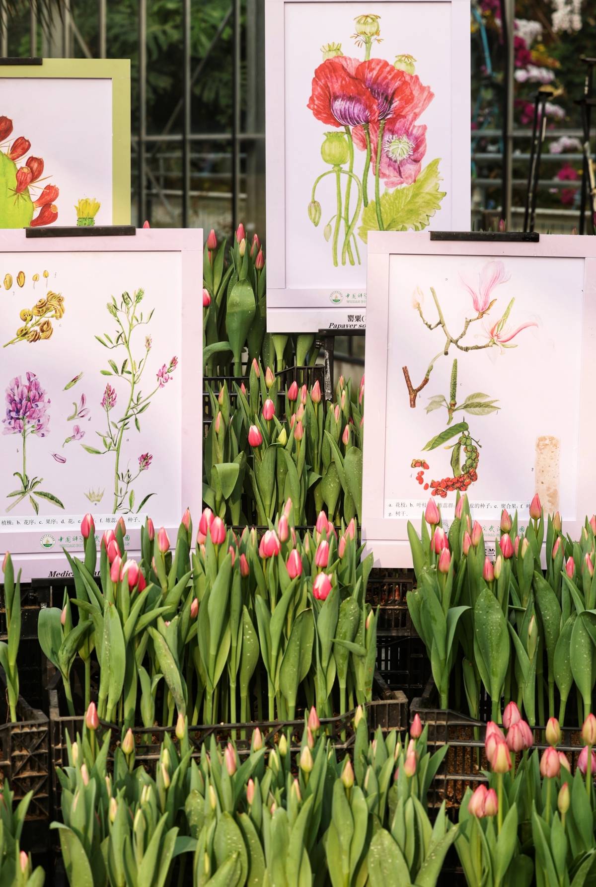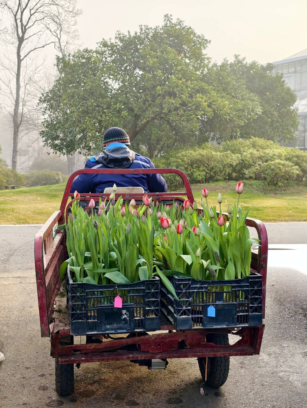 走进武汉植物园,最先撞入眼帘的,是一片热火朝天的布展景象。工作人员穿梭在花丛间,忙着将一盆盆郁金香安置到中心花坛、景观温室门口和园区主干道两侧。