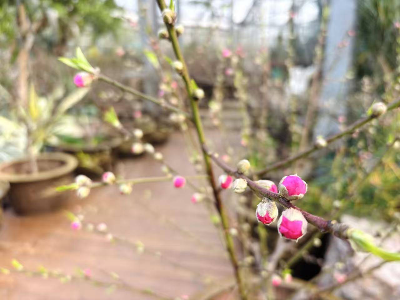 桃花的催花秘诀,则全在温度的“循序渐进”。桃花落叶后,先放在7℃左右的低温环境中,让花芽充分分化。等到春节前一个半月,再把它们搬进室内。初期室温控制在5至10℃,之后慢慢升温到20℃至25℃。通过模拟冬去春来的气温变化,“唤醒”沉睡的花芽,让桃花在春节期间迎来盛花期。