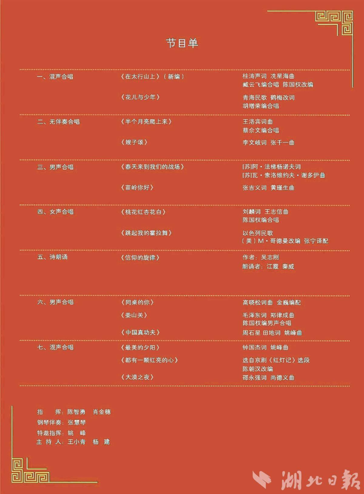 本场音乐会精心遴选了14首中外合唱作品,既有经典的合唱作品《忆秦娥 娄山关》《在太行山上新编》《大漠之夜》《嫂子颂》,又有优秀的民歌合唱作品《半个月亮爬上来》《桃花红杏花白》《苗岭你好》《花儿与少年》;既有外国合唱作品《春天来到我们的战场》《跳起我的霍拉舞》,又有根据流行歌曲改编的合唱作品《同桌的你》,根据戏曲唱段改编的合唱作品《都有一颗红亮的心》等,充分展现了武汉市老干部合唱团四十年的艺术积淀、不懈追求,以及驾驭不同音乐风格的能力。